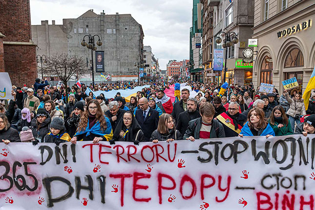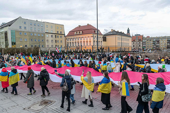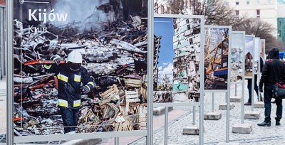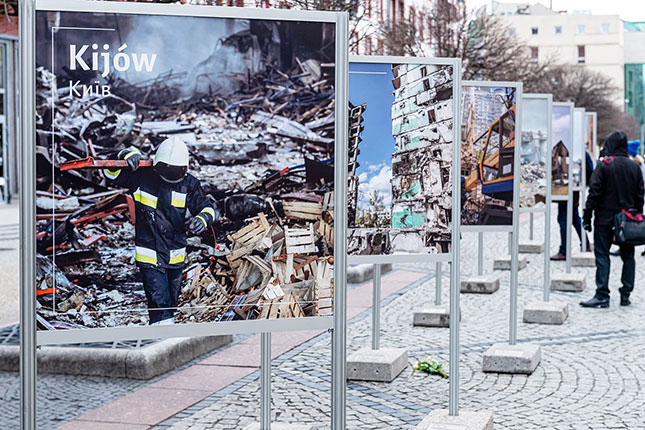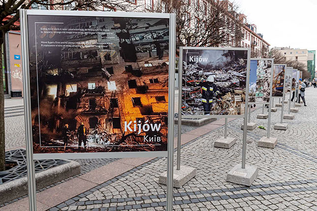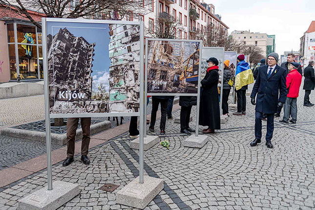 - 24 лютого у польському місті Вроцлав відбулось відкриття фотовиставки "Завтра ми прокинемося на день ближче до нашої перемоги". На виставці представлені фото українських міст, що постраждали через війну, а також, для порівняння — фото міст Європи, які були зруйновані під час попередніх війн. Так організатори хочуть підтримати українців та нагадати, що зруйновані міста будуть відбудовані. Виставка включає і світлини з експозиції «Київ – незламне серце Європи».