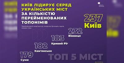 Лише минулого року в столиці перейменували 237 вулиць, проспектів та бульварів, чиї назви були пов’язані з країною-агресором чи радянським минулим. Київ випередив Вінницю (232), Кривий Ріг (183), Кам’янське (182) та Суми (179). Загалом із 2014 у столиці перейменовано 471 об’єкт вуличної мережі.