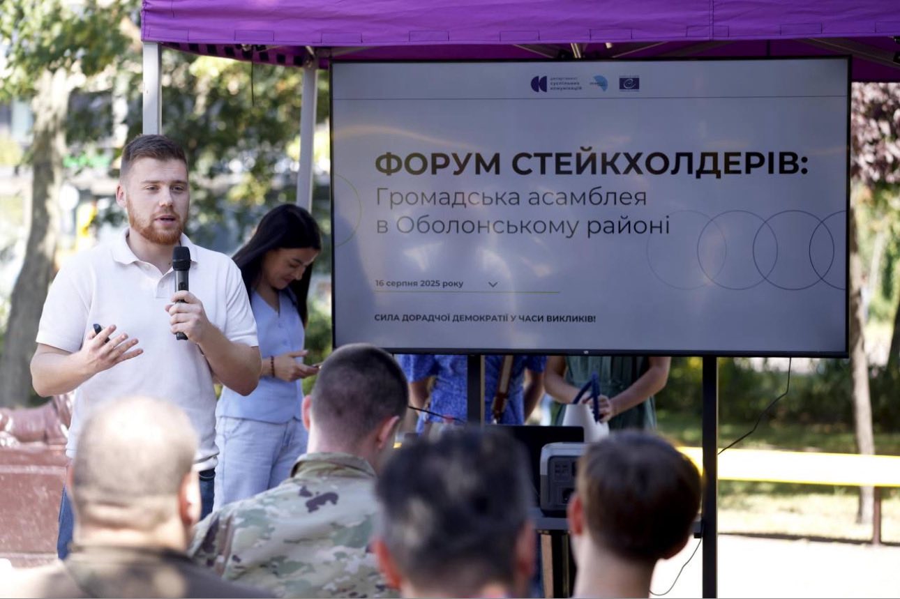 Громадська асамблея - це сучасний формат співпраці влади з громадою на основі деліберативної демократії. Департамент суспільних комунікацій КМДА разом з Центром комунікації та Оболонською районною в місті Києві державною адміністрацією провели перший етап Громадської асамблеї - Форум зацікавлених сторін на тему «Комплексна підтримка ветеранів та членів їхніх родин в Оболонському районі міста Києва».