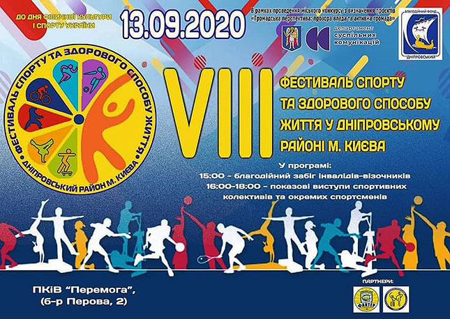 13 вересня 2020 року в парку культури та відпочинку «Перемога» пройшов Фестиваль спорту і здорового способу життя у Дніпровському районі м. Києва, який відбувся в рамках культурно-мистецького і спортивного проєкту «10-років шляхами добрих справ» - переможця міського конкурсу з визначення проєктів «Громадська перспектива: прозора влада та активна громада».