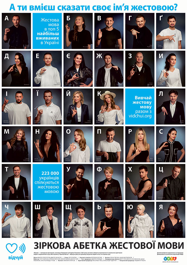 «Зіркова абетка» – це фотопідказки, на яких відомі співаки, ведучі, артисти та спортсмени жестами передають літери українського алфавіту. Її мета – привернути увагу до теми втрати слуху і адаптації нечуючих людей. За статистикою, кожен дев’ятий українець втрачає слух і часто про це не здогадується. Жестовою мовою говорять понад 250 000 українців, але його не вчать у школах навіть на базовому рівні.