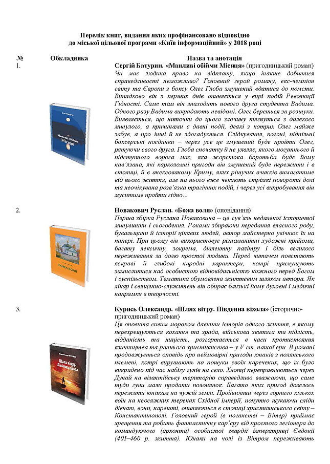 За інформацією управління інформаційної політики та комунікацій Департаменту суспільних комунікацій, 4572 примірники книг, надрукованих коштом міського бюджету в рамках Міської цільової програми на 2016‒2018 роки «Київ інформаційний» у 2018 році, надійдуть до фондів 136 бібліотек столиці.