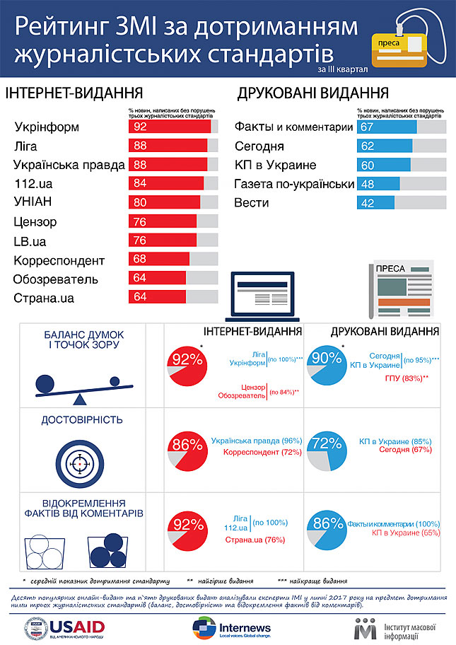 З друкованих ЗМІ перше місце зайняла газета «Факты и комментарии», у якій 67% матеріалів написано без порушень журналістських стандартів.