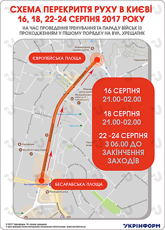 «Укрінформ» підготував інфографіку з детальною схемою перекриття руху на час проведення репетицій та проведення параду військ до Дня Незалежності України