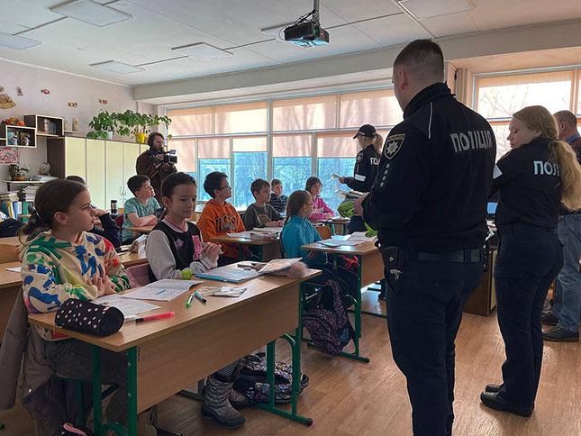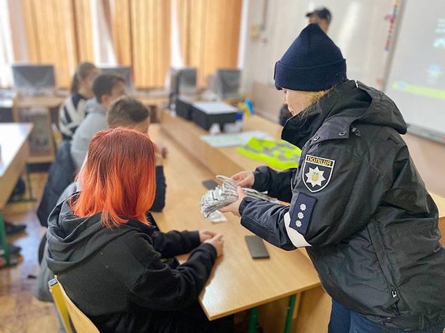 Першу частину світловідбивальних стрічок 9 лютого отримали учні школи на Оболоні. Працівники Департаменту разом із патрульною поліцією завітали до класів, аби не тільки віддати школярам ще запаковані стрічки, а й нагадати про важливість правильно носити аксесуари.