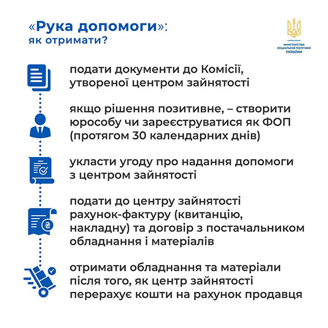Для отримання такої допомоги людина, яка має бажання розпочати підприємницьку діяльність, має звернутися до найближчого Центру зайнятості.