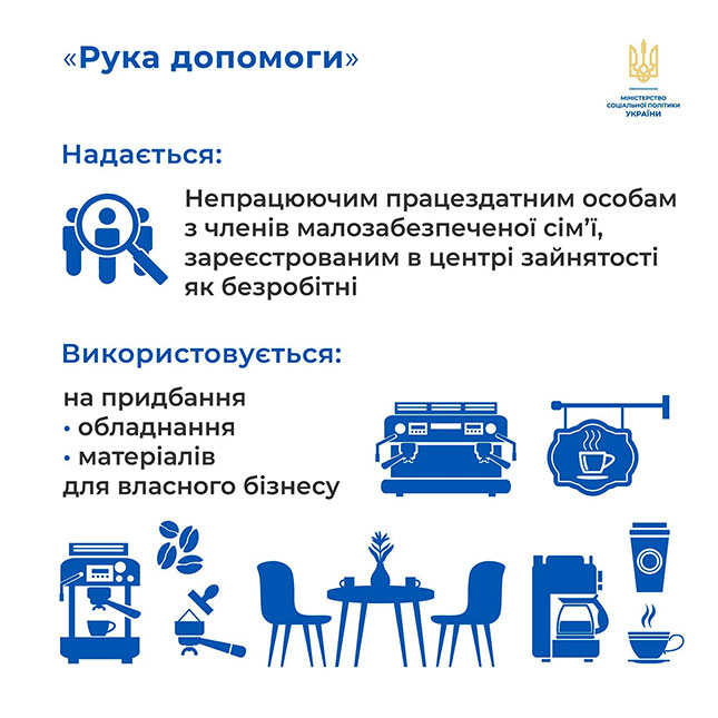 В рамках цієї політики Мінсоцполітики перезапускає програму «Рука допомоги», яка спрямована на допомогу малозабезпеченим особам у відкритті власної справи.