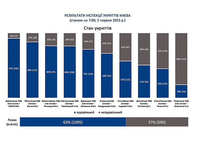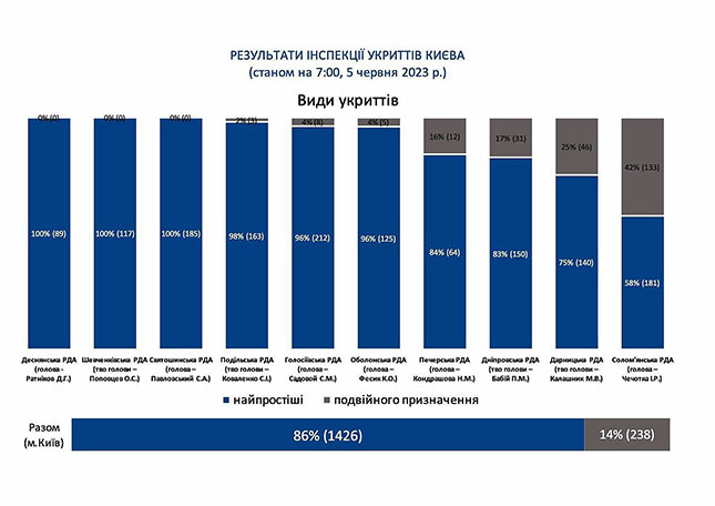 Мер Києва Віталій Кличко оприлюднив результати перевірки понад 1600 укриттів у всіх районах столиці станом на ранок 5 червня. Дані комісії, до якої увійшли представники ДСНС, поліції, райдержадміністрацій і служб міста, він оприлюднив у своєму Telegram-каналі.