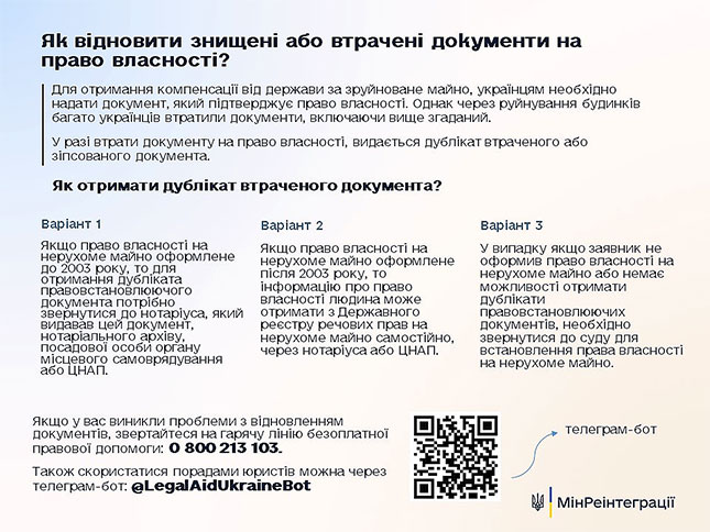 Міністерство з питань реінтеграції тимчасово окупованих територій України спільно з Міністерством юстиції України розробили інфографіку щодо порядку відновлення знищених чи втрачених документів на право власності пошкодженого/зруйнованого житла.